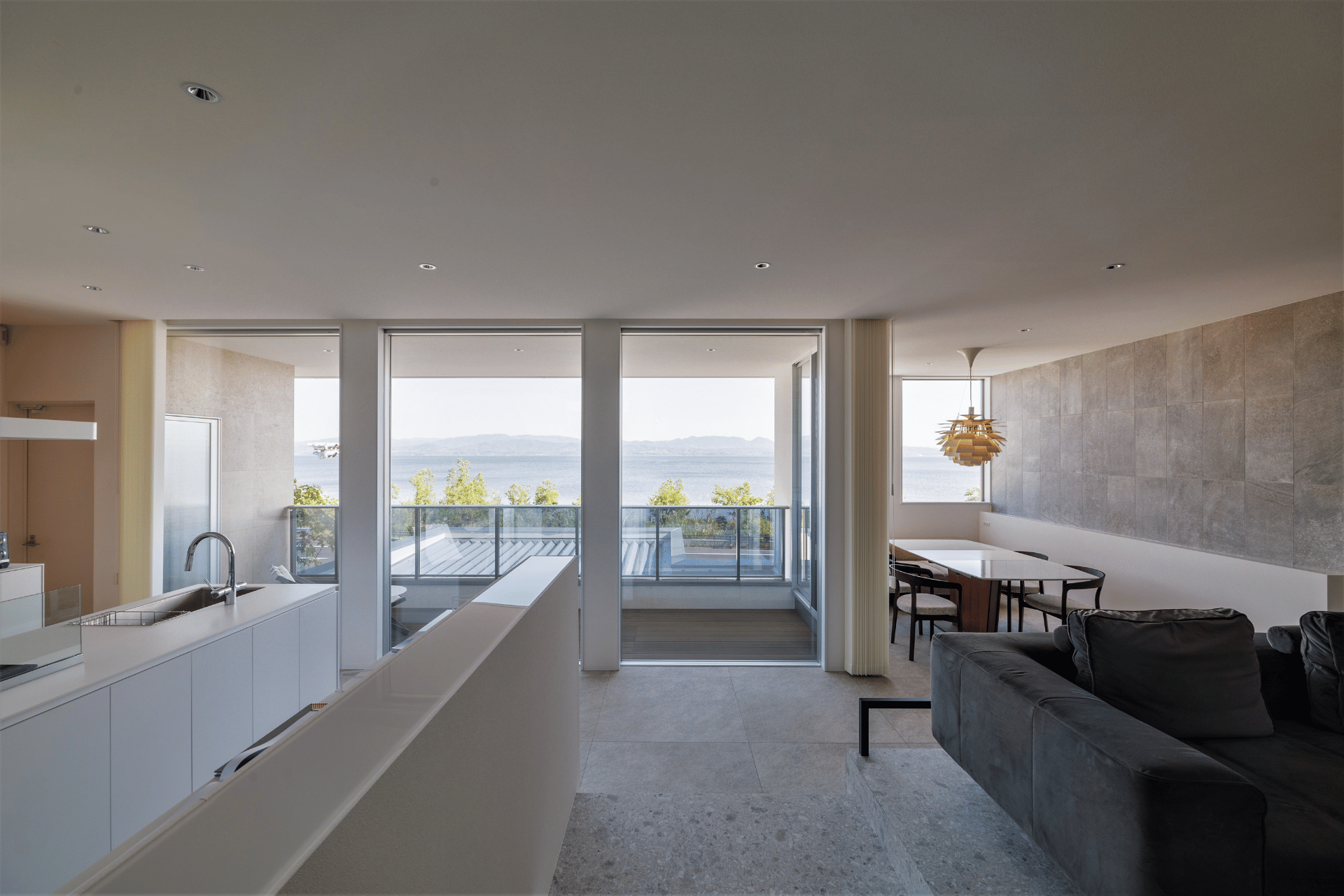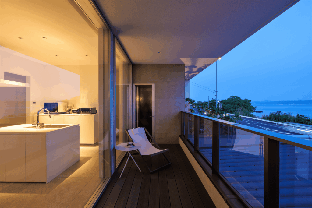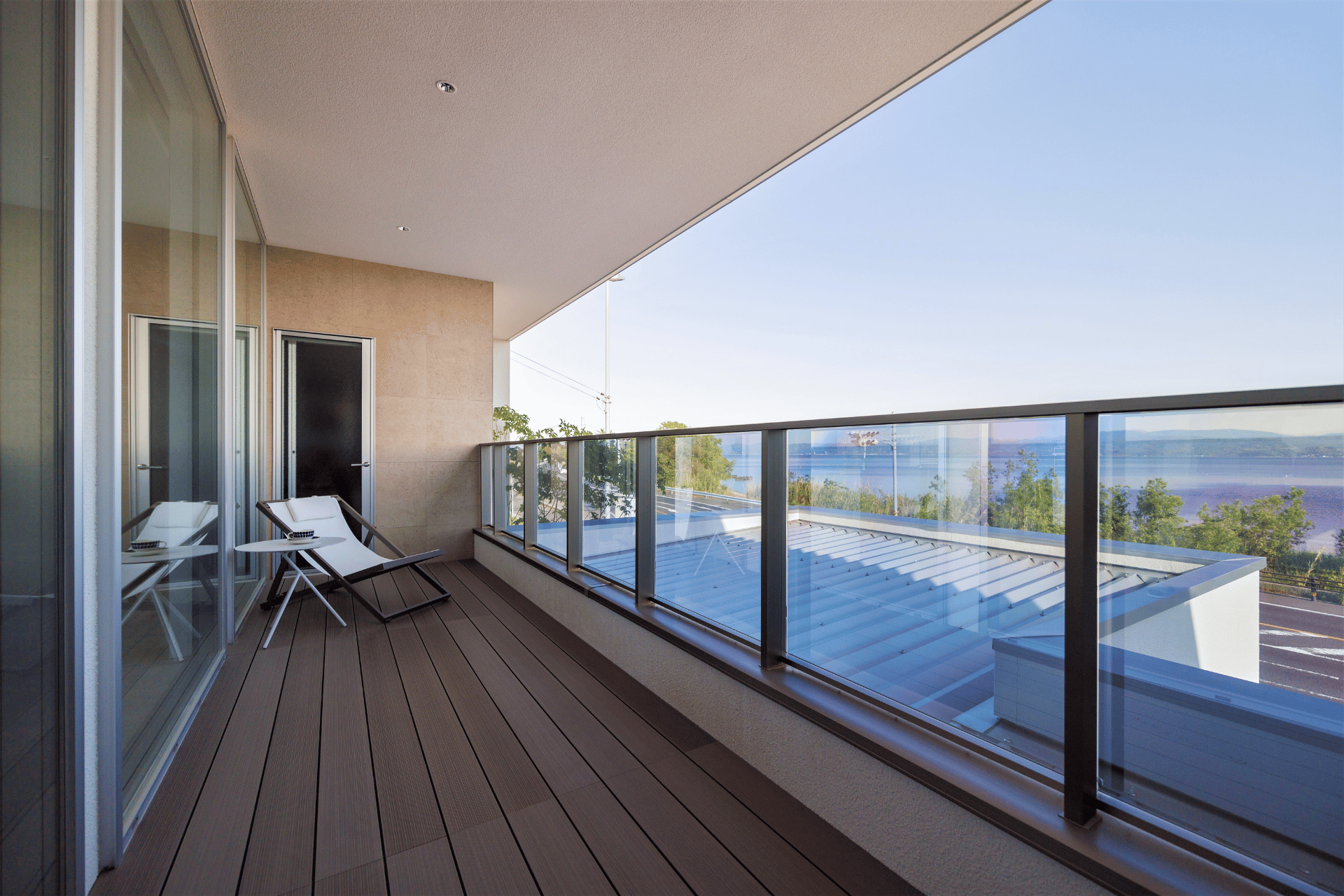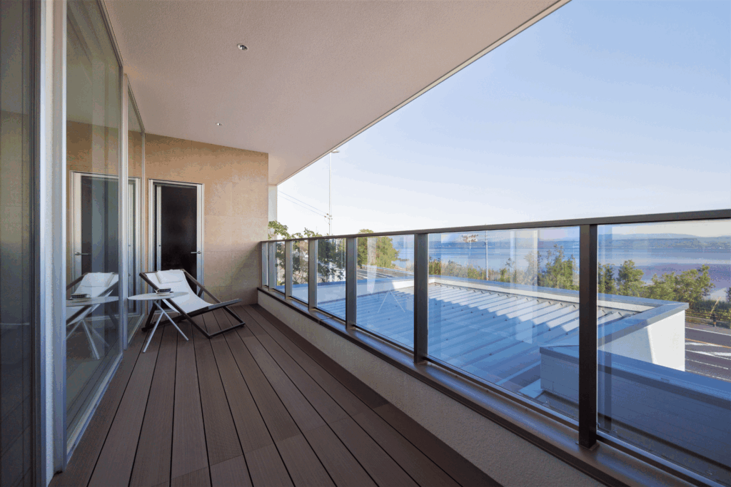 バルコニーの手すりにガラス面材の「FLグレンダー」を採用いただき、リビングはまるで海を望む絶景スポットに。