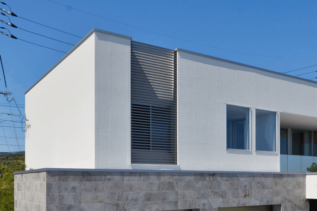さらに、窓には横格子スクリーンを設置することで、規則的に並ぶ格子が建物全体にリズム感とアクセントをプラス。