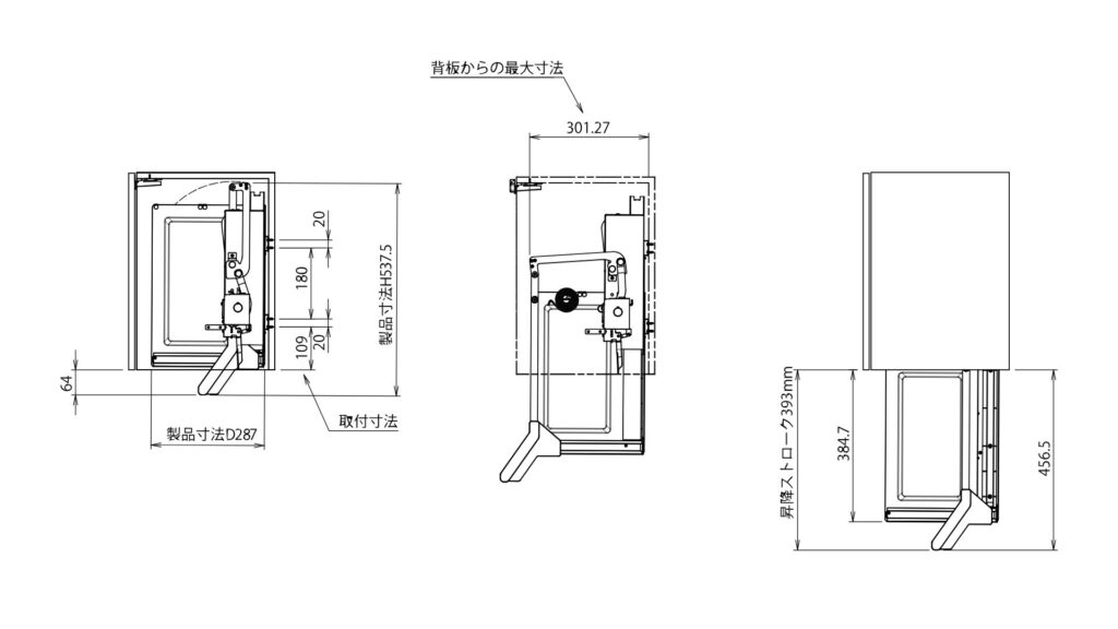 リニアダウンボックス 垂直昇降ストローク(寸法等はイメージ)