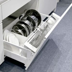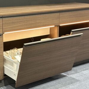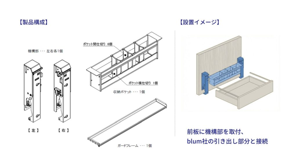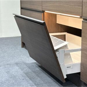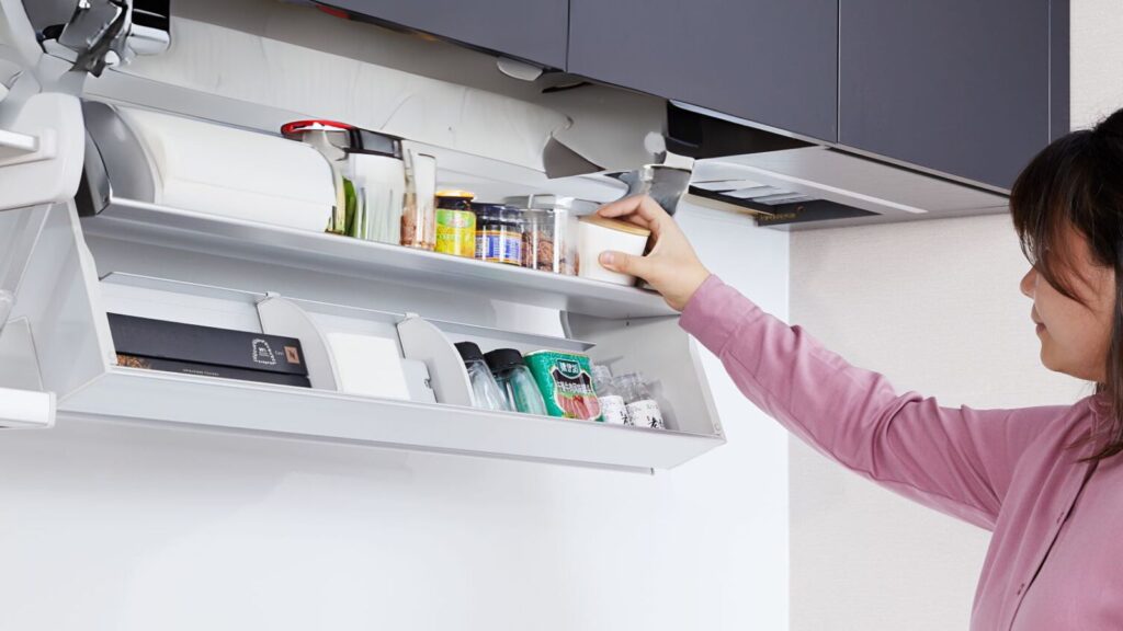 特殊な”傾ける”機構が、引き出しを開ける際の初期負荷を50%減。また、大口のポケット収納が、サッと開いてくるから、よく使うものを、一緒に使う単位で、まとめて取り出せ、家事の負担・導線を劇的に改善します。