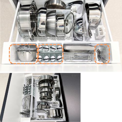 20㎜の幅広ポケットだから、よく使うお鍋やフライパンも取り出しやすい位置に。