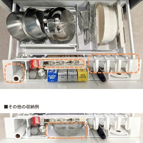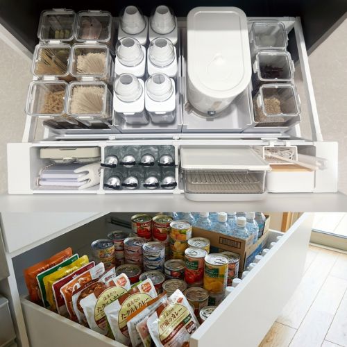 飲料水や缶詰、レトルト食品などの備蓄用食品の保管場所も引き出しを軽く使い勝手UP!
