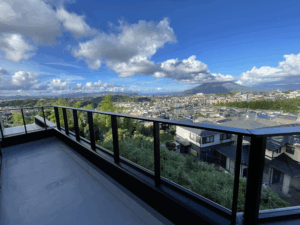 桜島の絶景を暮らしに取り込む、洗練されたガラスバルコニー